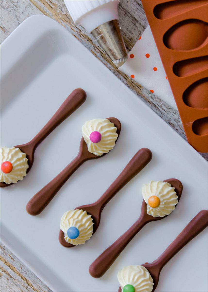- Si queremos presentarlo de forma original podemos hacer unas cucharitas de chocolate utilizando moldes preparados para ello (aquí podéis comprarlos), y rellenar las cucharitas con la mousse de limón introduciéndola en una manga pastelera.