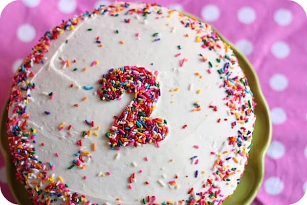 Para hacer el número necesitaréis un cortante, como en la imagen, o podéis haceros un stencil cortando a mano el número en un trozo de papel de horno, como hemos visto en la primera tarta con los topos. Espolvoreáis con sprinkles con cuidado de no saliros del borde ¡y listo!