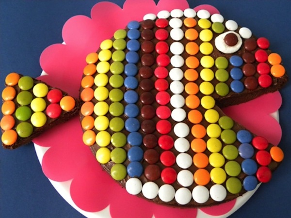 Los Lacasitos son grandes aliados a la hora de decorar tartas, porque son deliciosos y muy coloridos. Esta tarta pez tan simpática es realmente sencilla de hacer, sólo tenéis que preparar una tarta redonda, cortar una porción para dejar el hueco de la boca del pez y a la vez usarla como cola, cubrir la tarta con alguna crema tipo Nutella para que los Lacasitos se peguen y decorarla a gusto, combinando los colores de la manera que os parezca más bonita. Para hacer el ojo podéis usar una nube cortada, con un Lacasito marrón en el centro.