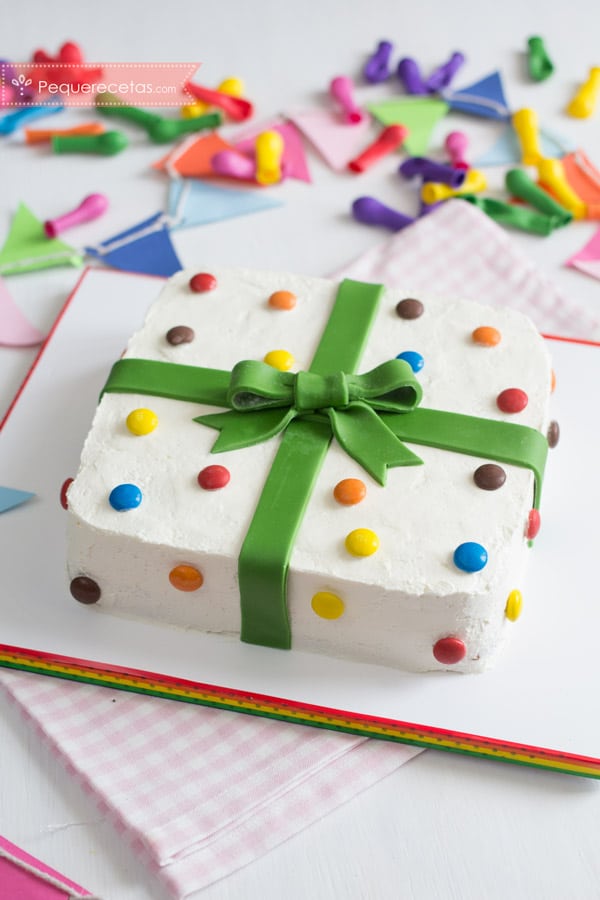 Esta tarta la he encontrado en Pequeocio junto con otras tartas de cumpleaños fáciles. No hace falta que la tarta sea de varios pisos, podemos usar esta decoración para una más pequeña.