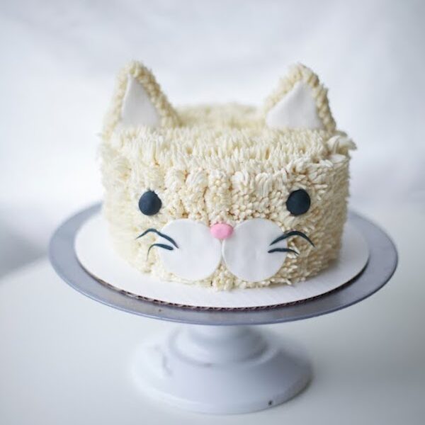 Si os dais un poco de maña con la manga de pastelero, sólo necesitaréis una boquilla de césped, una crema densa para decorar y un poco de fondant para hacer los detalles como los ojos y el hocico. Os bastará con cubrir toda la tarta con la boquilla y luego agregarle unos triángulos de bizcocho para las orejas y cubrirlos también. Después podéis hacer los detalles con un poco de fondant, pero como veis son muy sencillos.