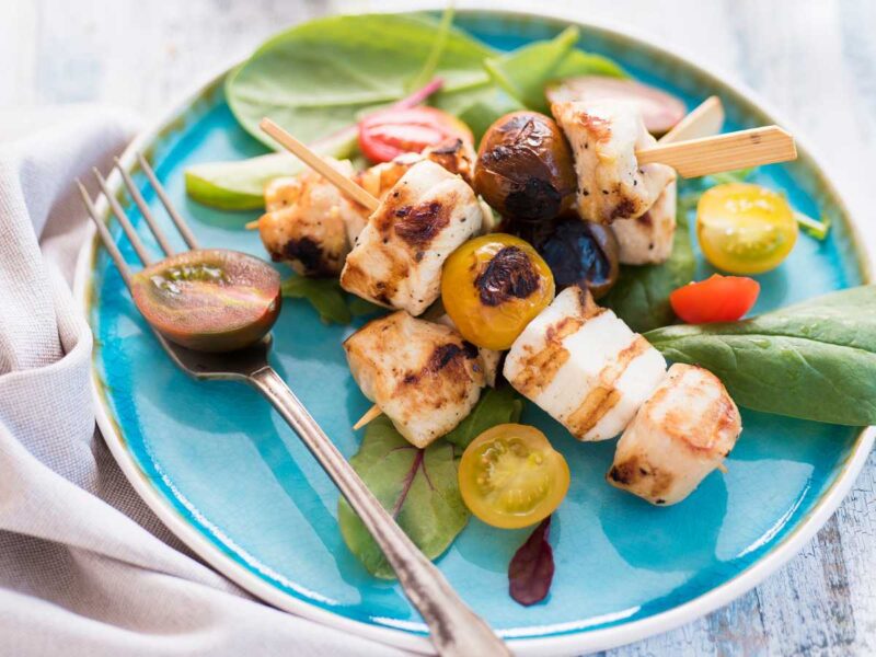 Corta el halloumi en cubos y ensártalos en palillos de brocheta junto con cubos de pechuga de pollo, y tomatitos cherry. Ásalas en la parrilla o en la sartén hasta que el queso esté dorado y las verduras tiernas. Acompáñalas con arroz o una ensalada.