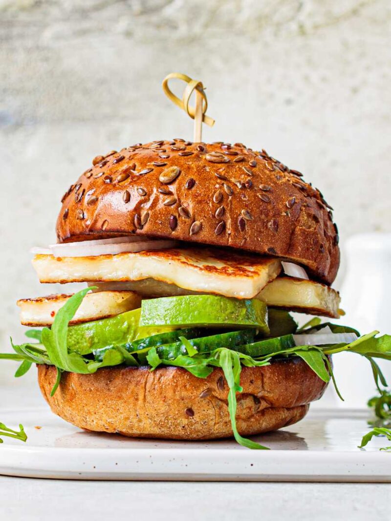 Sustituye la carne por una rodaja gruesa de halloumi a la plancha y colócala en un panecillo con tomate, lechuga y una pizca de orégano. Una opción vegetariana, deliciosa y rápida para los días más ajetreados.