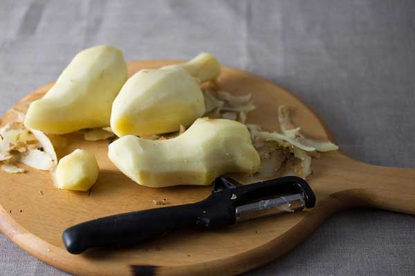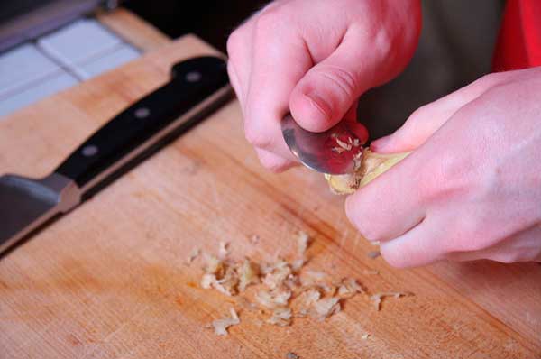 8. Para pelar el jengibre es mejor utilizar una cuchara, así evitarás llevarte parte de la carne con el cuchillo. Utiliza el canto de la cuchara raspando el jengibre hasta que lo peles.