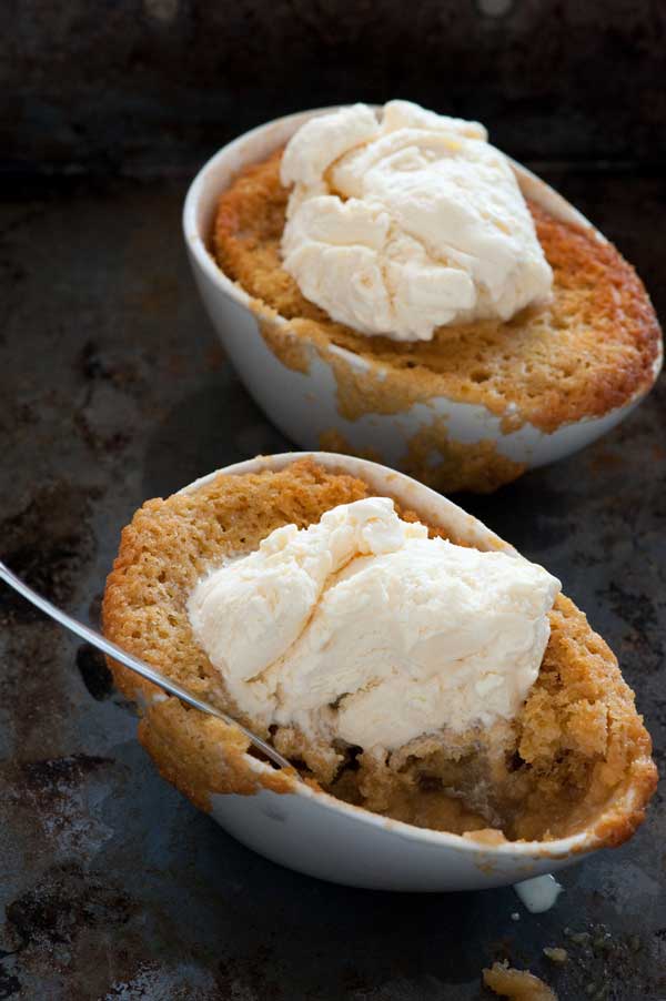 Preparación: Precalienta el horno a 180ºC. Derretir la mantequilla en una cacerola mediana. Retirar del fuego y agregar el jengibre y la mitad del azúcar morena (100g). Revolver y agregar los huevos, batiendo bien después de cada uno. Mezclar ligeramente la harina hasta que se mezcle bien. Si queda algún grumo no te preocupes. Dividir la mezcla del pastel en 4 ramekins o recipientes de silicona aptos para el horno.