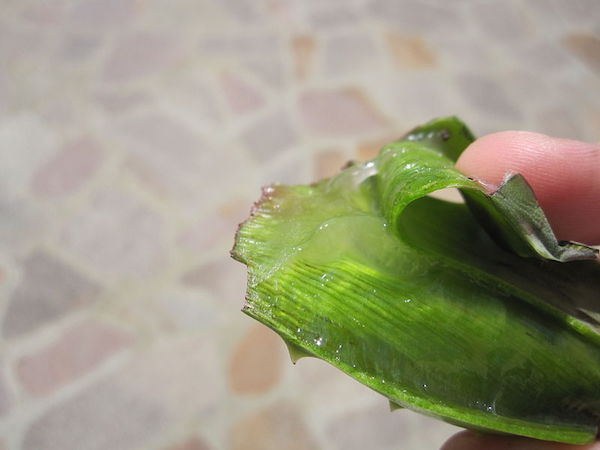 - Gel: es la pulpa de las hojas, de color transparente. Está compuesto principalmente por agua, enzimas y minerales. Podemos usar el gel de aloe vera en uso externo para el tratamiento de la piel, o en uso interno para la gastritis y la úlcera gástrica. A diferencia del látex, no tiene efecto laxante ni es irritante.