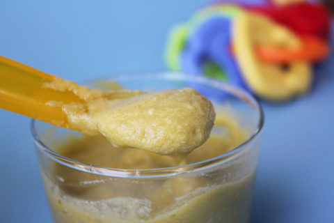 Añadiremos a la papilla de verdura con base de leche que comentamos en el artículo de “Como introducir las verduras” 20 g de carne sin piel y una cucharada de postre de aceite de oliva. No añadiremos sal hasta el año por lo menos.