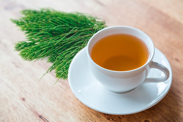 - Echamos una cucharadita colmada de cola de caballo seca (puedes comprarla online aquí) en una taza con agua hirviendo. Cubrimos con un plato y dejamos reposar 5 minutos. Luego colamos y endulzamos a gusto (la infusión es bastante amarga)