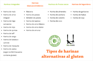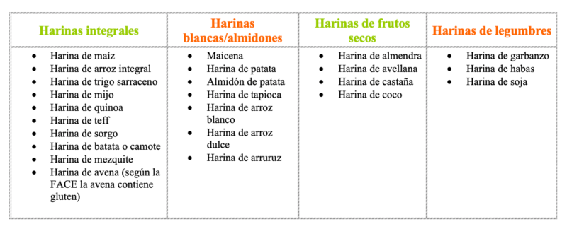 En esta tabla puedes ver las diferentes alternativas que tienes si eres celíaco o tienes intolerancia al gluten. La harina de trigo es la más utilizada en repostería y está compuesta por proteína y almidón. Por eso, al buscar sustitutos, es mejor combinar harinas integrales con almidones para que los preparados funcionen mejor.
