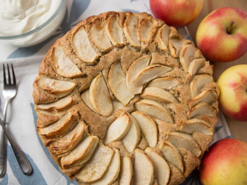 Ingredientes: 160 g de manzanas (peladas y ralladas); 200 g de nata o crema de leche; 40 g de endulzante líquido a base de stevia; 3 huevos; 50 g de leche; 30 g de mantequilla fundida; 130 g de harina; 2 cucharaditas de canela en polvo; medio sobre de levadura en polvo tipo Royal (aprox 8 g); 2 manzanas cortadas en gajos finos. Para la cobertura: 60 g de mermelada de albaricoque sin azúcar añadido; 60 ml de agua; 15 ml de zumo de limón.