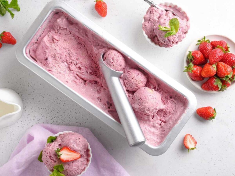 Ingredientes: 500 ml de leche semidesnatada; 250 ml de nata para montar bien fria(crema de leche); 1 1/4 cucharadita de polvo blanco de stevia; 2 huevos; 450 g de fresas