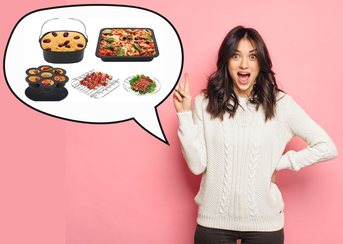 Hemos visto hasta ahora los accesorios para freidora de aire que consideramos esenciales: moldes, papel de hornear, alfombrillas reutilizables, pinzas para alimentos, pulverizador de aceite, rejillas y bandejas.