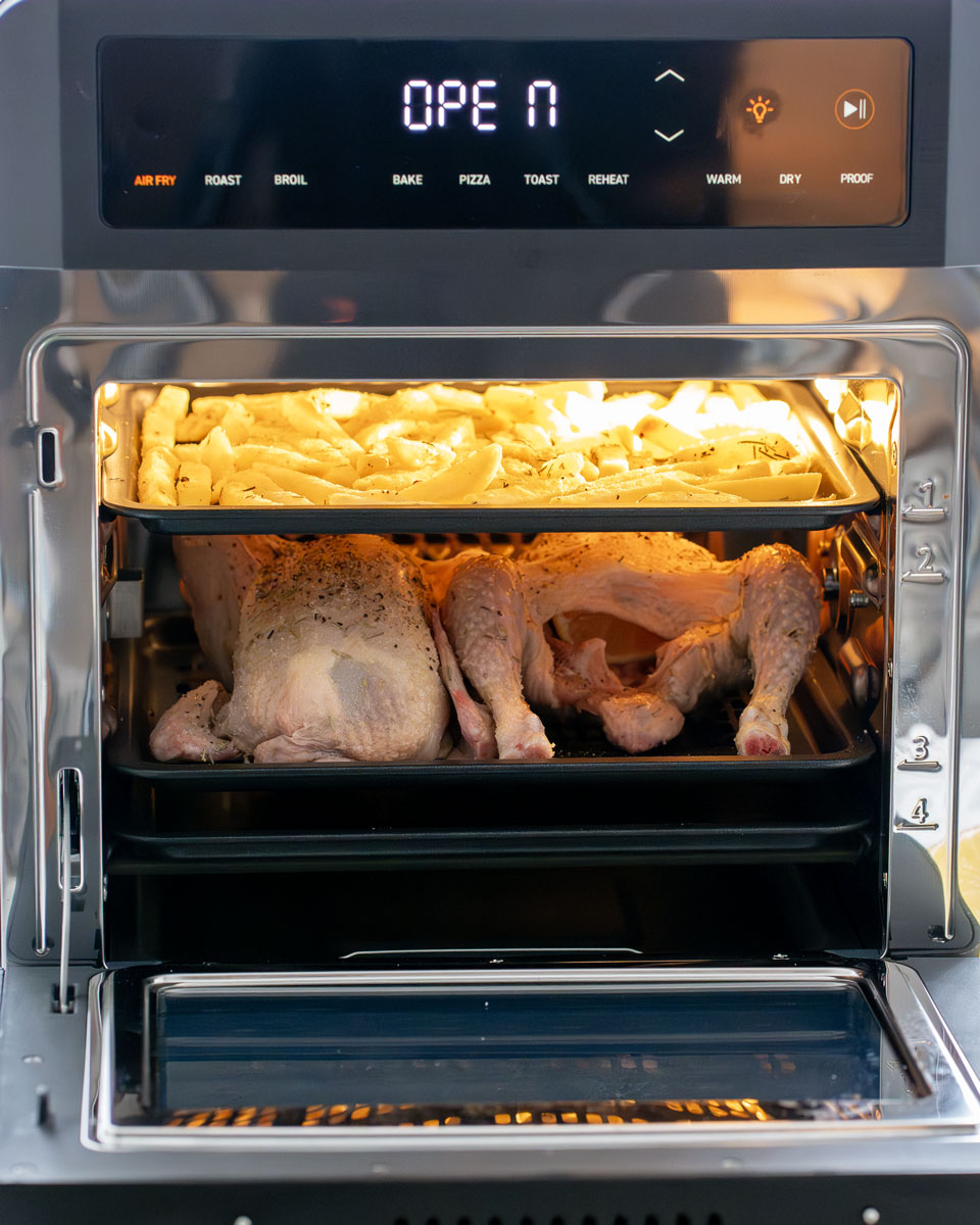Además sin ocupar mucho más que una freidora de aire convencional sí ofrece mucha mayor capacidad de cocinado, ya que pasamos de los 6 Litros de capacidad media de las freidoras de aire tradicionales, a unos considerables 12 litros que nos permitirán cocinar varios platos a la vez.