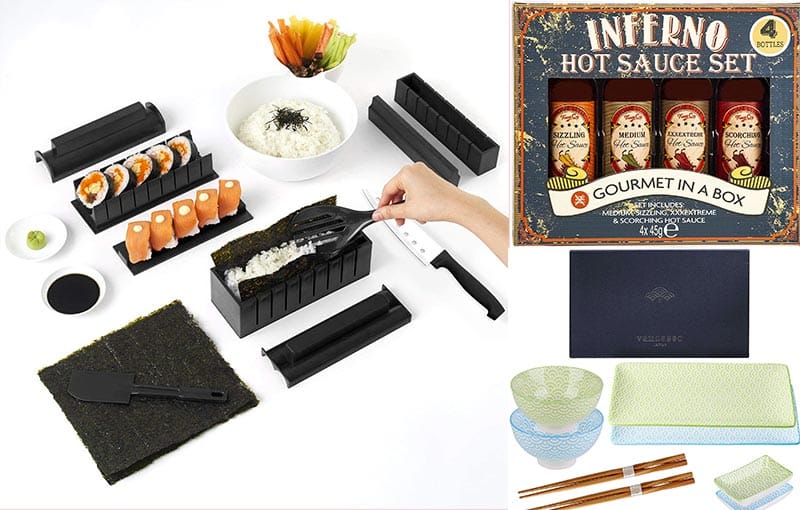 Para aquellos que aman la cocina japonesa y se deleitan preparando sushi casero, dos regalos que seguro apreciarán muchísimo: la Vajilla para sushi elegante y sobria, y el Juego de moldes y herramientas para hacer sushi. Si lo que más aman es el picante y la comida mexicana, seguro que este Set de salsas picantes será un regalo muy apreciado.