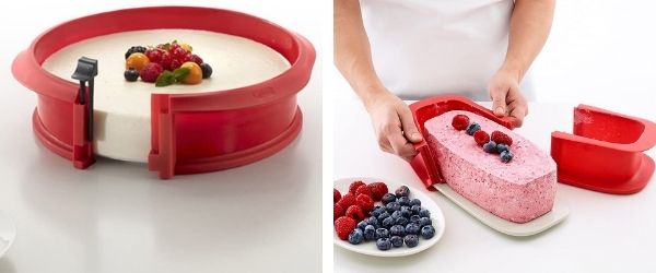 En cuanto a moldes, a nosotros nos gustan especialmente los moldes de silicona desmontables como este redondo de Lékué con plato de cerámica que nos permite servir directamente el bizcocho o tarta sin trasladarlo a otro plato, o el rectangular, también desmontable y con plato de cerámica. Son algo más caros (entre 20 y 30€) pero una inversión segura.
