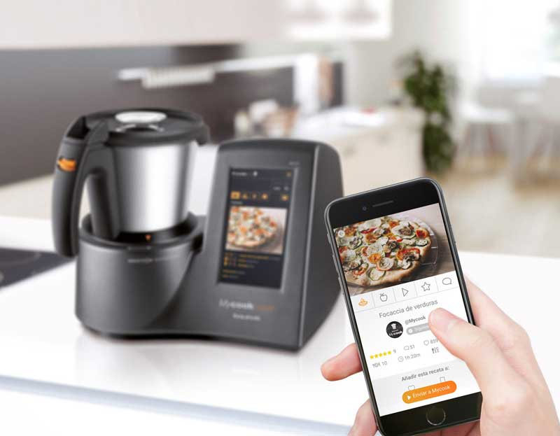 Es el primer robot de cocina inteligente con conexión wifi, pantalla táctil de 7” y conexión multidispositivo que permite la comunicación, interacción y sincronización de la información entre robot de cocina, smartphone o tablet y ordenador web. A través de su pantalla de 7” tienes acceso a las recetas, ver comentarios sobre las mismas, y toda la actualidad del Club Mycook.