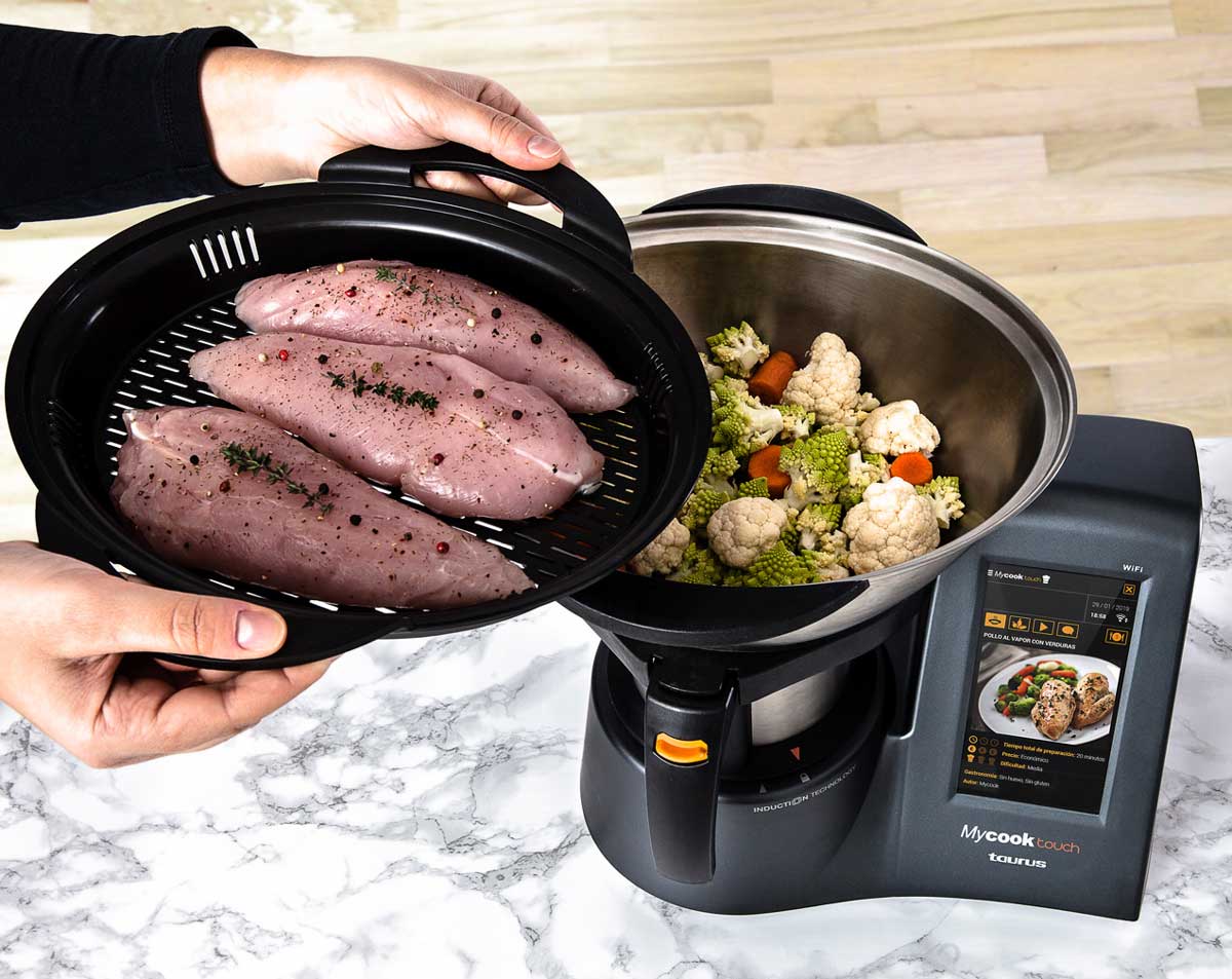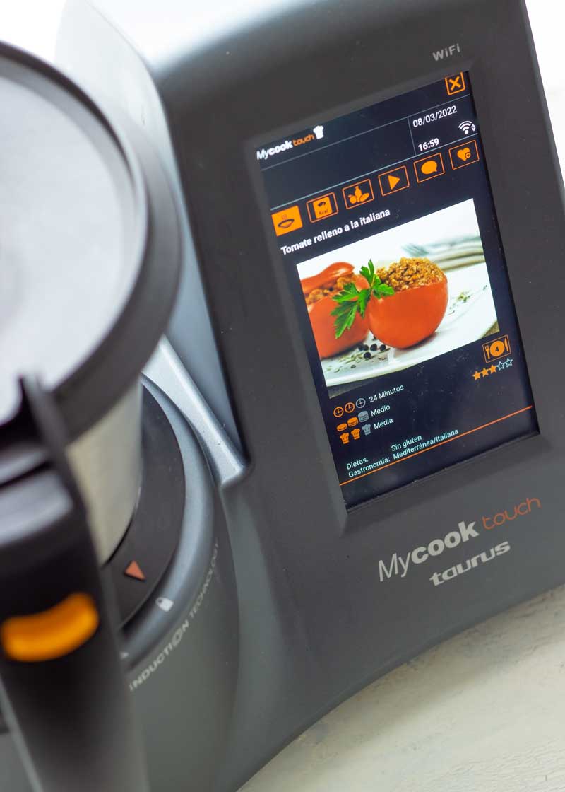 El Taurus MyCook Touch tiene conexión multidispositivo a través de Wi-Fi con pantalla táctil de 7″. Dos modos de cocinado: manual y recetas guiadas. Tiene 10 velocidades y 4 funciones especiales (sofrito, amasado, turbo y balanza). Su principal diferencia frente a sus competidores es que calienta por inducción de 40 a 140º C.