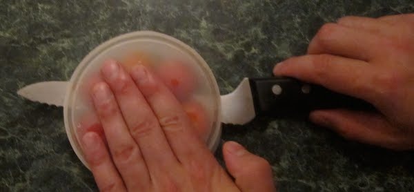 - Cortar tomates cherry rápidamente: Cuando tenemos que cortar tomates cherry y otro tipo de verdura o fruta pequeña, que debemos usar en gran cantidad, podemos pasarnos un buen rato en ello. Usando un cuchillo muy afilado y dos tapas de algún recipiente que tengan reborde podemos cortar muchos tomates al mismo tiempo, simplemente teniéndolos quietos entre las dos tapas con una ligera presión de la mano. Además nos evitaremos las salpicaduras… ¡Los tomates cherry son muy traicioneros!