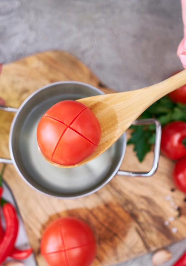 - Pelar tomates fácilmente: Haz una cruz en la base y sumérgelos en agua hirviendo por 30 segundos.