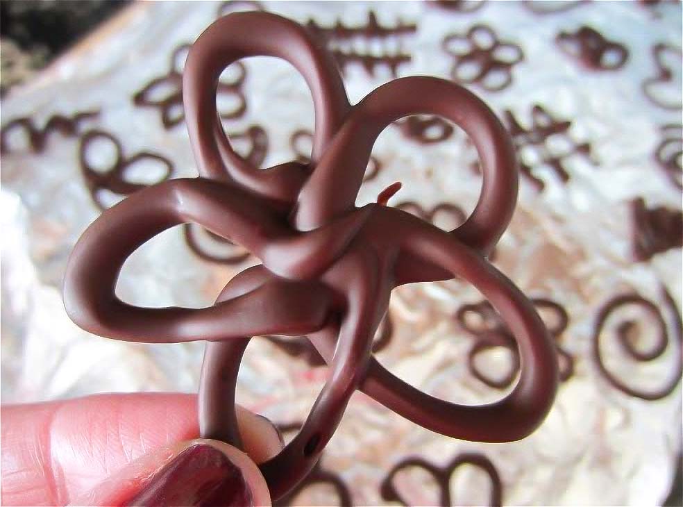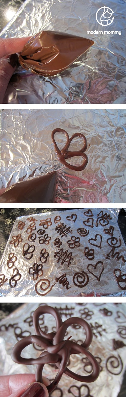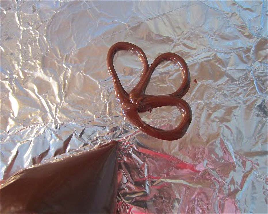 - Fundimos el chocolate al baño maría o en el microondas y lo introducimos en la manga o en la bolsa, con las tijeras cortamos la punta y sobre el papel de horno dibujamos el motivo que más nos guste, una flor, un corazón…echadle imaginación.