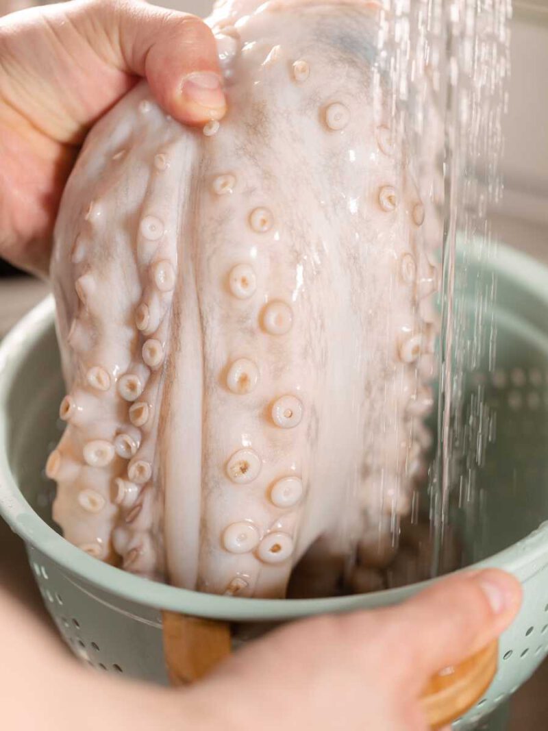Después de haber retirado las vísceras y el pico, enjuaga nuevamente el pulpo bajo agua fría para asegurarte de que todas las partes internas están completamente limpias.