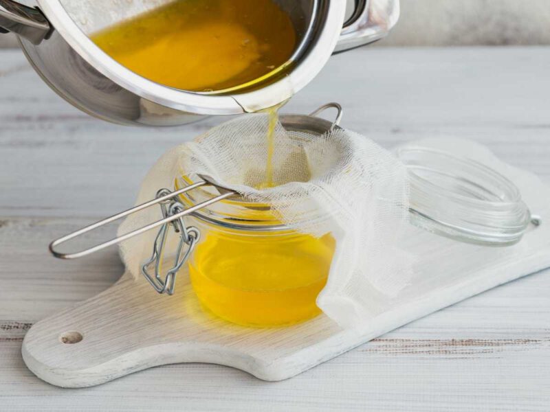 - Vierte el ghee filtrado en un frasco de vidrio limpio y seco. Deja que se enfríe completamente antes de taparlo.