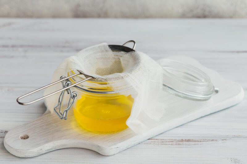 - Deja que el ghee se enfríe un poco y luego cuélalo a través de un colador de malla fina o una gasa para eliminar los sólidos de la leche.