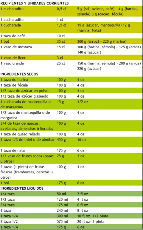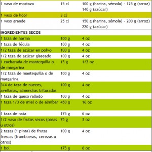 - Cucharadas (tbsp), cucharaditas (tsp), tazas (cups) y pintas (pints) para volumen.