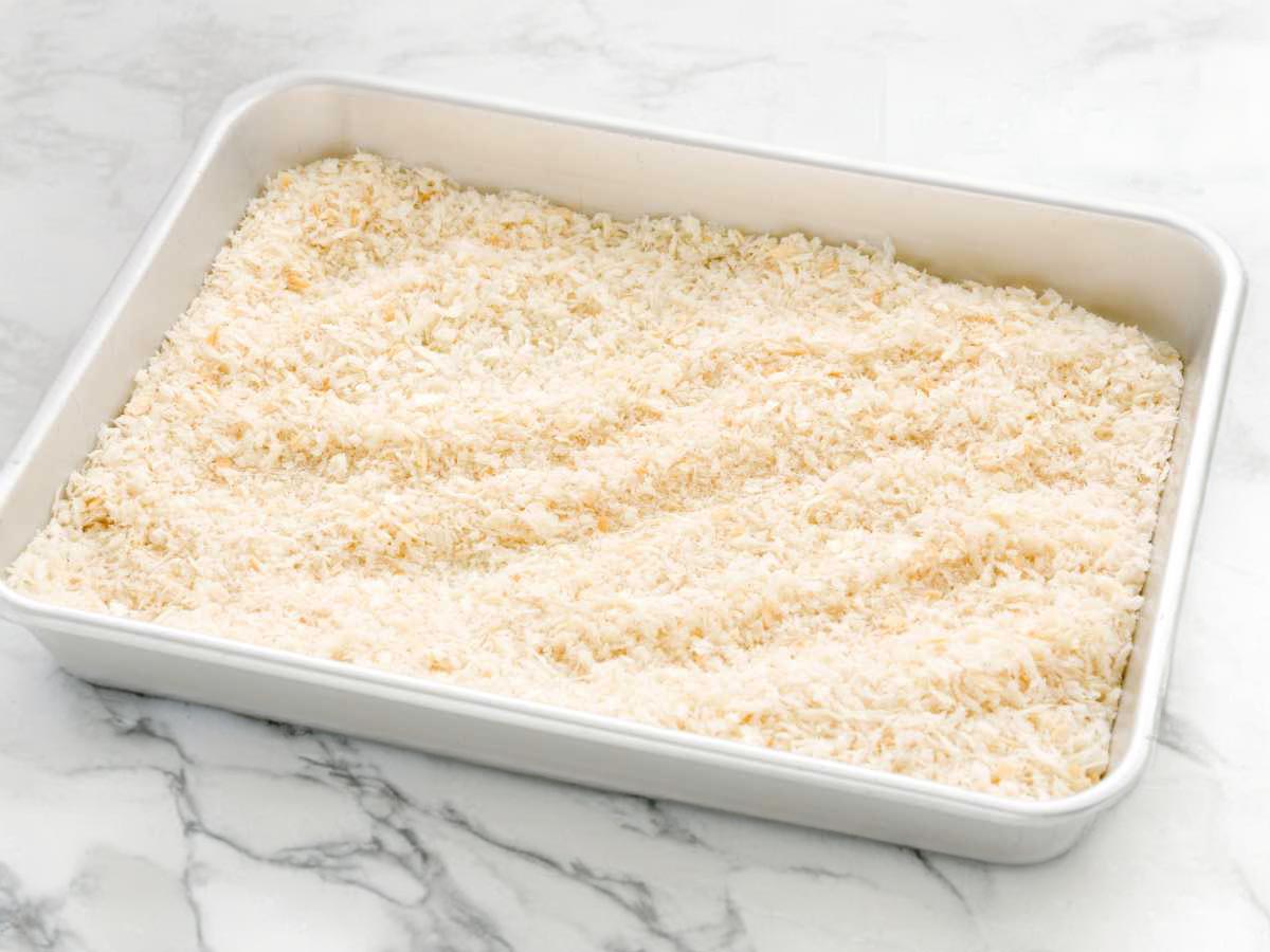 - Precalienta el horno a 120 °C (250 °F). Distribuye los copos de pan sobre una bandeja de horno y tuesta en el horno durante unos 5 a 10 minutos, o hasta que estén completamente secos pero no dorados. Vigila constantemente para evitar que se quemen.