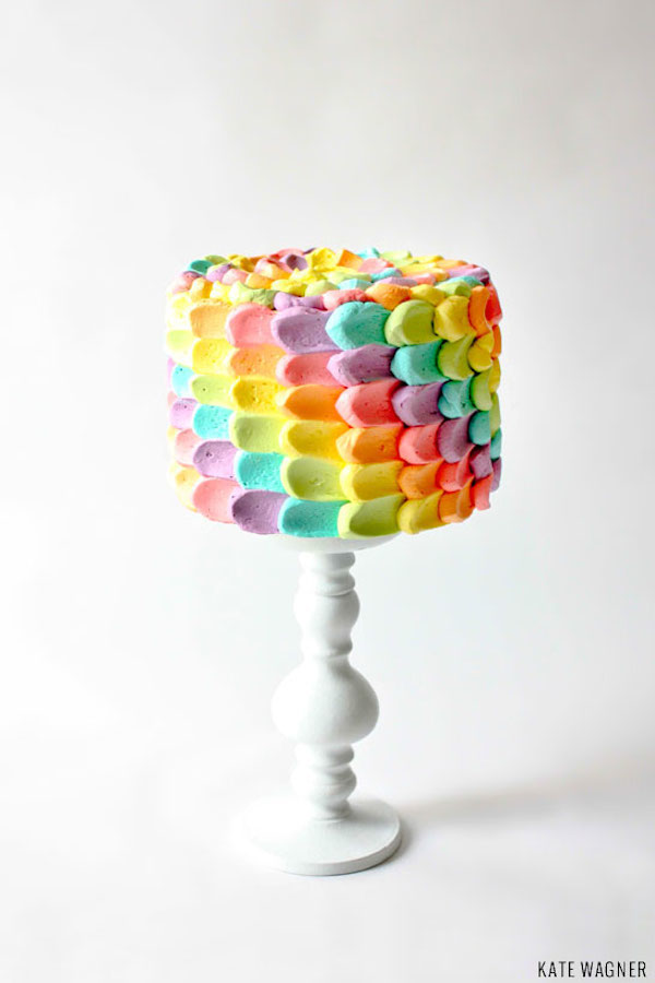 El secreto está en teñir el frosting con colorantes alimentarios de varios colores y ponerlo en diferentes mangas desechables, a las que les haremos un agujero en la punta. Luego vamos haciendo unos puntos gordos de diferentes colores en una fila vertical y con una cuchara los aplastamos hacia un costado, formando esa especie de pétalos que se ven en la foto. Hacemos una nueva fila de puntos al lado, sobre la parte más aplastada de la fila anterior, y volvemos a aplastar. Seguimos así hasta completar toda la tarta. Sencillo, ¿verdad? Si os queda alguna duda en el enlace debajo de la imagen podéis ver las fotos del paso a paso.