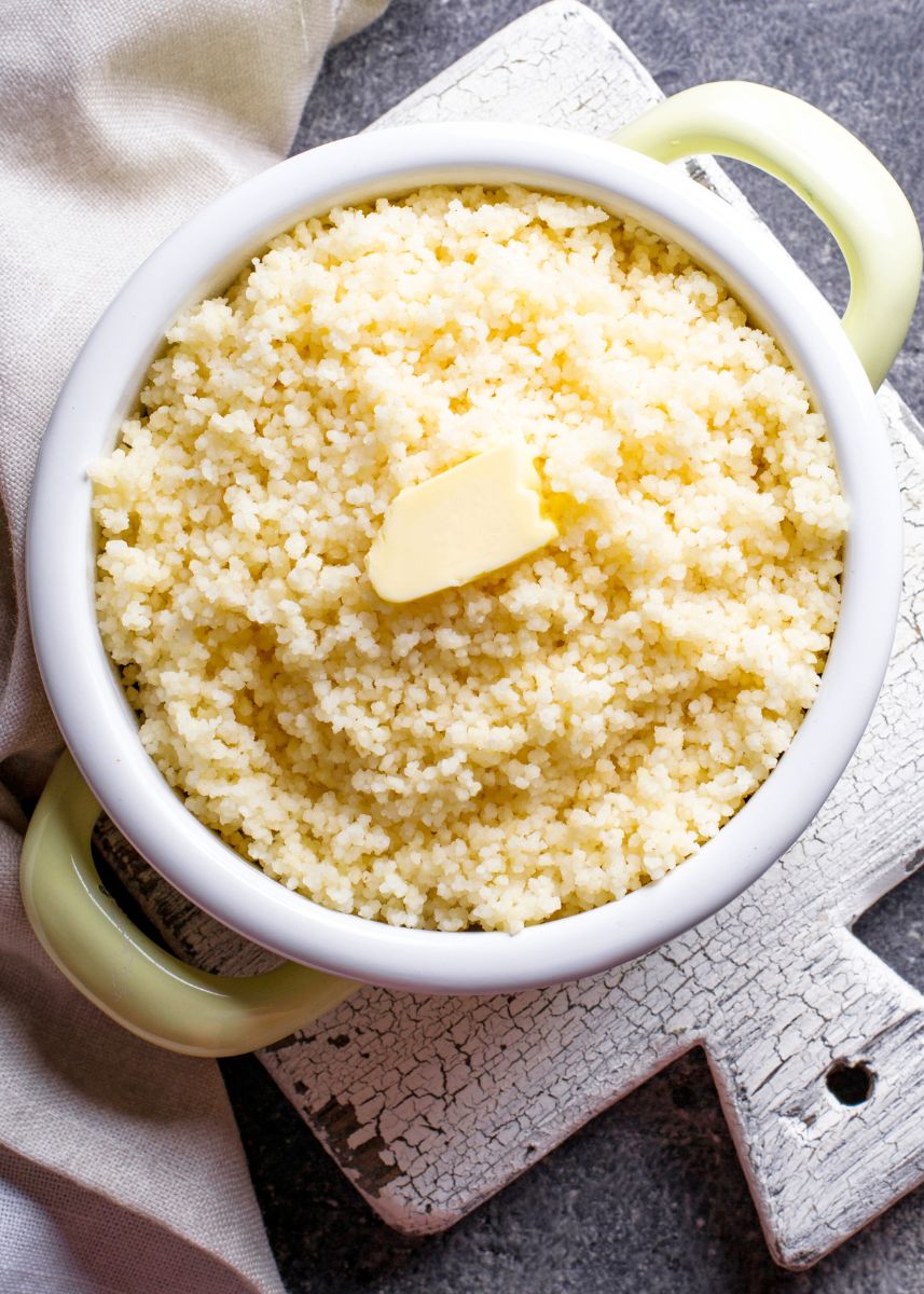 - Agregar 1 cucharadita de mantequilla, y desgranar el cuscús con la ayuda de un tenedor, girando y moviendo hasta que los granitos queden sueltos.