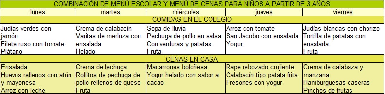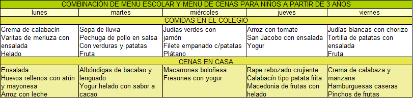 Con todos estos consejos en la mano, a continuación os mostramos un ejemplo de cómo combinar un menú escolar con un menú semanal de cenas equilibradas en casa.