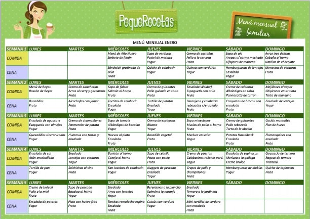 Como siempre os decimos, este menú semanal os puede servir como guía, y podéis adaptarlo a los gustos de vuestra familia; incluid cada día frutas y verduras, y varias raciones de legumbres y pescado a la semana. Recordad también que es aconsejable limitar el consumo de carnes rojas a una o dos veces semanales, prefiriendo las carnes blancas. Y por último, pero no menos importante, no olvidemos que la clave para una vida sana es acompañar una alimentación equilibrada a la actividad física regular.