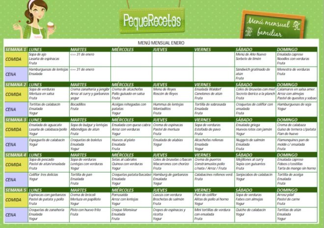 Os sugerimos también incluir alimentos de temporada en el menú, de este modo comeremos bien gastando menos y de manera más sostenible. Este mes hemos incluido recetas con verduras de invierno como las coles de bruselas; la coliflor (no os perdáis la coliflor tres delicias o el puré de coliflor); y las acelgas y espinacas, que incluimos en recetas como las espinacas con garbanzos, la tortilla de acelgas, las crepes de espinacas y ricotta o las acelgas con patatas.