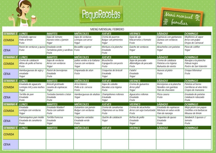 Ya estamos en febrero y como cada mes os traemos nuestro menú semanal para organizar las comidas y las cenas ahorrando tiempo, dinero y comiendo de manera equilibrada.