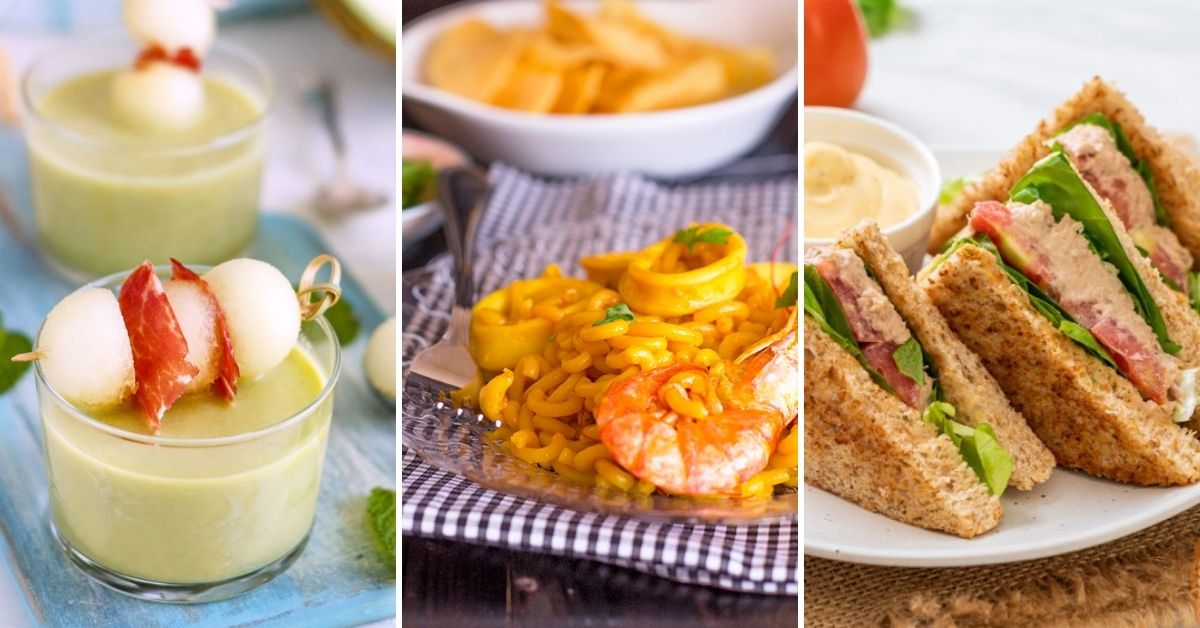 Entrantes frescos como el gazpacho y salmorejo, también gazpacho de melón, fresas, aguacate y sandía. Muchas ensaladas de todo tipo, desde las clásicas ensaladas de arroz y ensaladas de pasta hasta las famosas e internacionales ensalada griega, ensalada Waldorf o ensalada caprese. Para los domingos u otras ocasiones especiales reservamos los platos más elaborados pero que no pueden faltar en tu verano, como la paella de marisco y la fideuá.