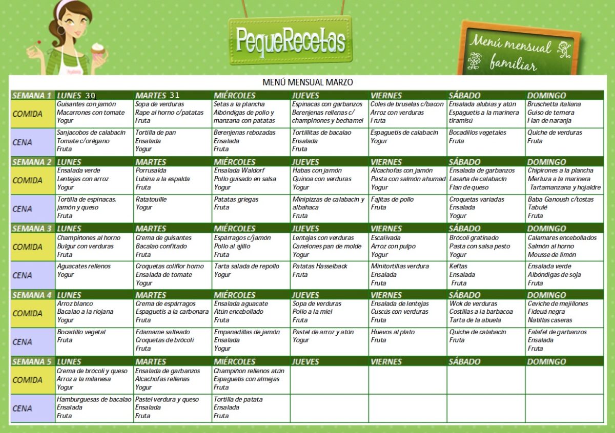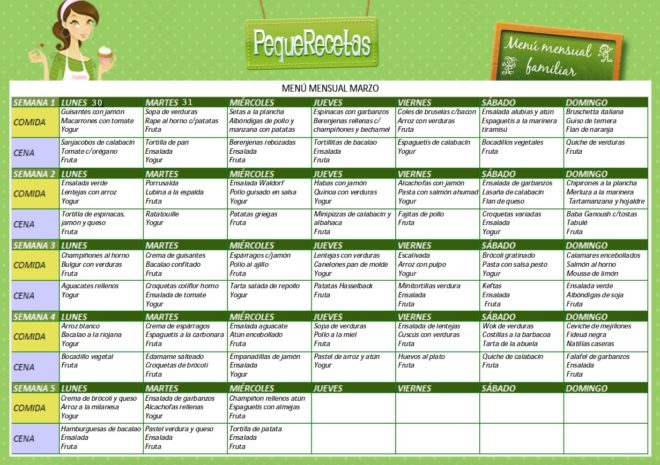 Probablemente podréis adaptar muchos de los platos que os proponemos a lo que tengáis en la despensa, ya que, como siempre son platos caseros y fáciles, pero no obstante os recomendamos también descargar nuestra plantilla de menú semanal en blanco aquí y así podréis adaptar las comidas a vuestras necesidades, ayudándoos con nuestras ideas y todas las sugerencias que os daremos estos días desde nuestras redes sociales: Facebook, Pinterest e Instagram.