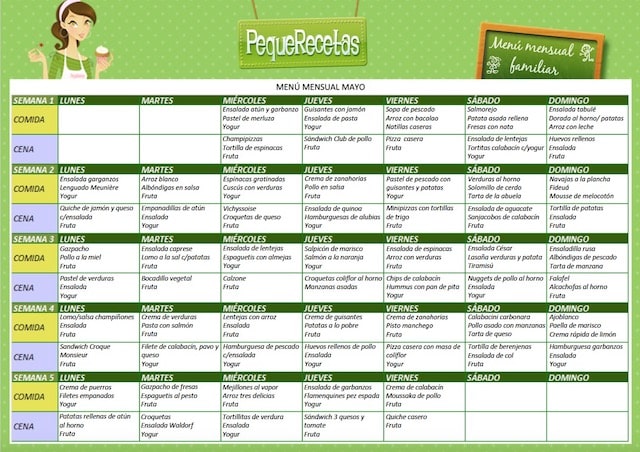 Como decíamos podéis usar nuestro menú como guía y modificarlo a vuestro gusto, pero no olvidéis estos consejos: incluid 2 o 3 raciones de legumbres y 2 o 3 raciones de pescado a la semana. Con las carnes rojas, mejor limitarnos a una ración semanal, y cada día incluid verduras y frutas. Y otra cosa fundamental: en un estilo de vida saludable, una buena alimentación va de la mano con la actividad física. Aprovechad el buen tiempo para dar paseos a pie o en bicicleta en familia, ir al parque, hacer excursiones, etc.
