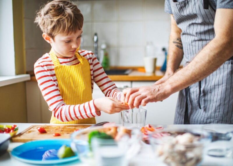 - Involucra a tus hijos en la cocina: Deja que te ayuden a preparar las comidas. Esto los motiva a probar nuevos alimentos.
