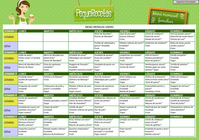 Os invitamos a que vosotros mismos elaboréis vuestro propio menú semanal con nuestra plantilla para adaptarlo a vuestros gustos familiares. Lo importante es que recordéis las recomendaciones de consumir pescado y legumbres varias veces a la semana, limitar el consumo de carnes rojas e incluir al menos 5 raciones de frutas y verduras cada día. Una buena idea es que tengáis piezas de fruta a la vista para que os resulten apetecibles y accesibles.