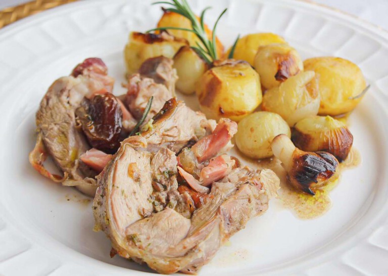 Pierna de cordero rellena al horno con patatas baby y cebollitas