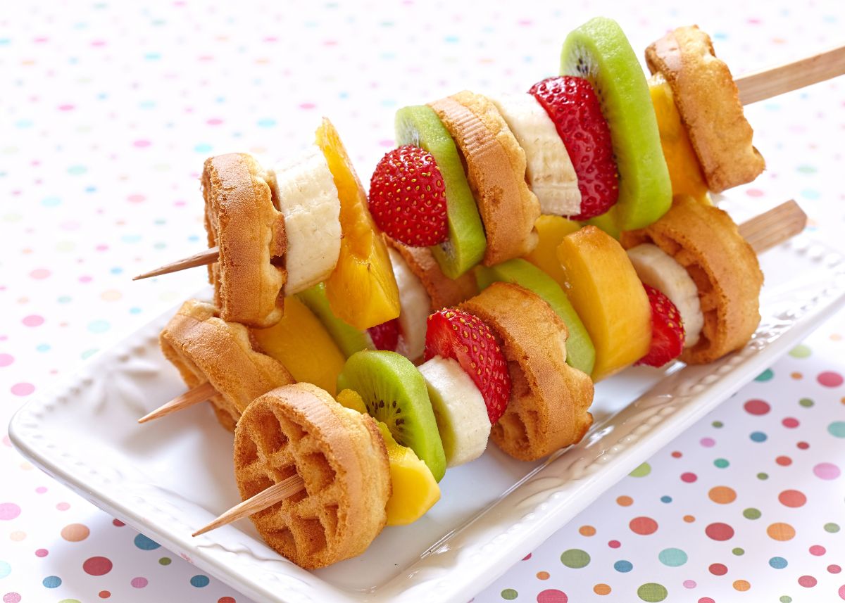Preparar brochetas de frutas para desayunar es una idea que nos encanta. Para ello solo tienes que cortar fruta, preparar unas tostadas francesas o unos gofres belgas y cortarlos en cuadraditos. Pínchalos en las brochetas alternándolos con la fruta fresca. Espolvorea con azúcar glass o riega con jarabe de arce ¡te va a enamorar este desayuno casero!