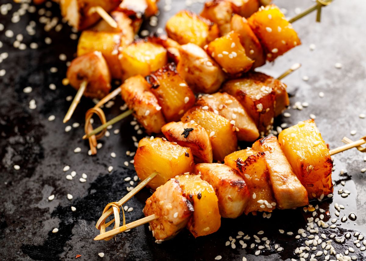 Seguro que has comido alguna vez pollo con piña ¿Y si lo sirves en brochetas? Mira qué espectacular queda al caramelizarse la piña. Espolvoréalo con semillas de sésamo para darle un toque diferente.