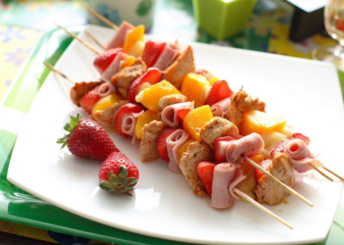 Brochetas de frutas con pollo y jamón