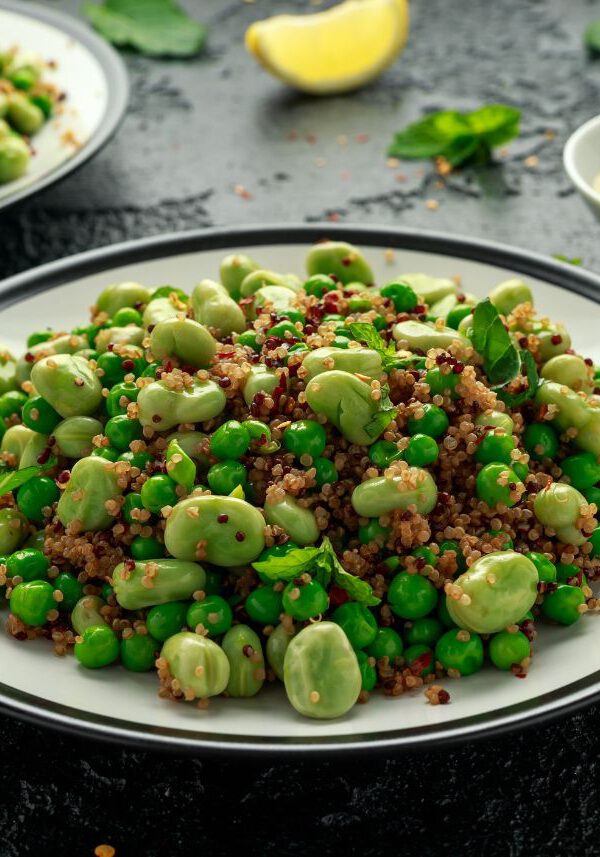 Las recetas con habas tiernas y los guisantes nos pueden llevar a engaño, porque aunque puedan parecer verduras en realidad son legumbres. Si las combinas con quinoa en una ensalada el resultado es espectacular y muy saludable: