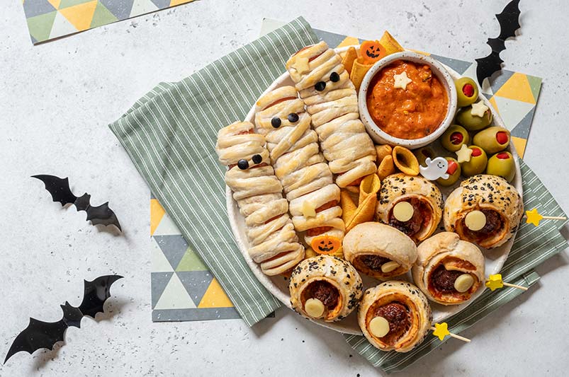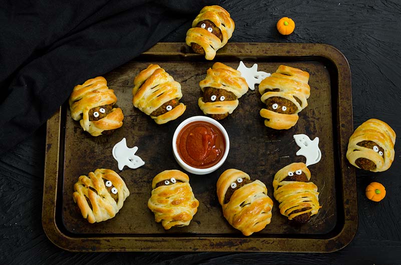 Para hacer un aperitivo de Halloween súper divertido podemos envolver unas ricas albóndigas caseras y unas salchichas con tiras de masa de hojaldre. Luego las metemos al horno a 180°C hasta que la masa esté dorada, unos 10-15 minutos. Completamos poniendo unos circulitos de aceituna negra para hacer los ojos de la momia, y unos círculos de queso para hacer la pupila de las ojo-albóndigas.