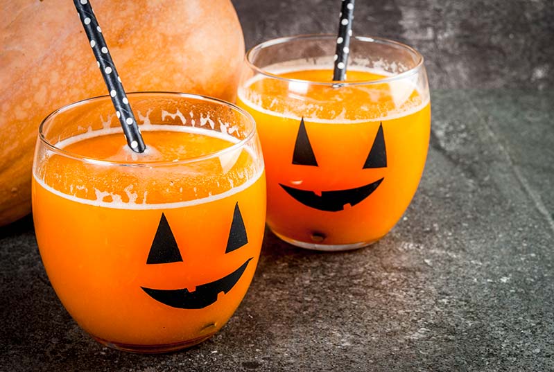 Para terminar, una receta de Halloween saludable: necesitaremos unos vasos con una forma un poco abombada. Los vamos a decorar recortando ojos y boca de la calabaza en vinilo adhesivo negro, y los usaremos para servir cualquier bebida naranja, por ejemplo un zumo de zanahoria natural.