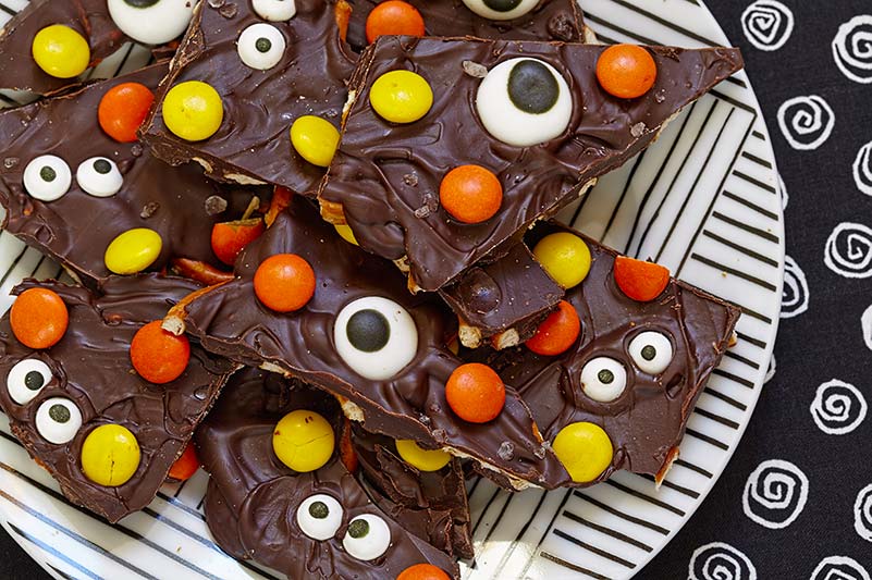 Fundimos el chocolate al microondas o a baño maría. Lo mezclamos con frutos secos y lo distribuimos en una fuente cubierta con papel de hornear. Decoramos con ojos y lacasitos y dejamos endurecer. Cuando estará duro, quebramos de manera irregular.
