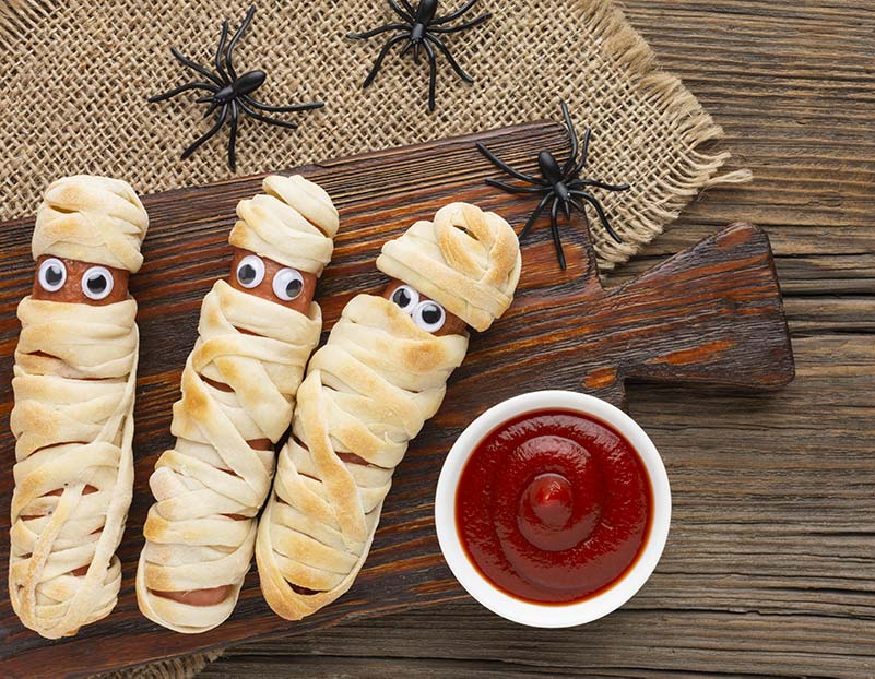 También podemos usar masa de pizza bien fina para hacer unas salchichas momia de Halloween como éstas, y para los ojos usar ojos de azúcar comestibles.