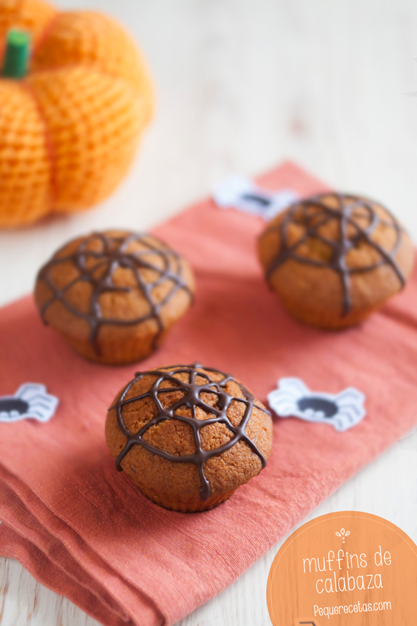 Una idea realmente sencilla pero muy rica son estos muffins de calabaza decorados con telas de araña de chocolate. No os perdáis la receta: muffins de calabaza